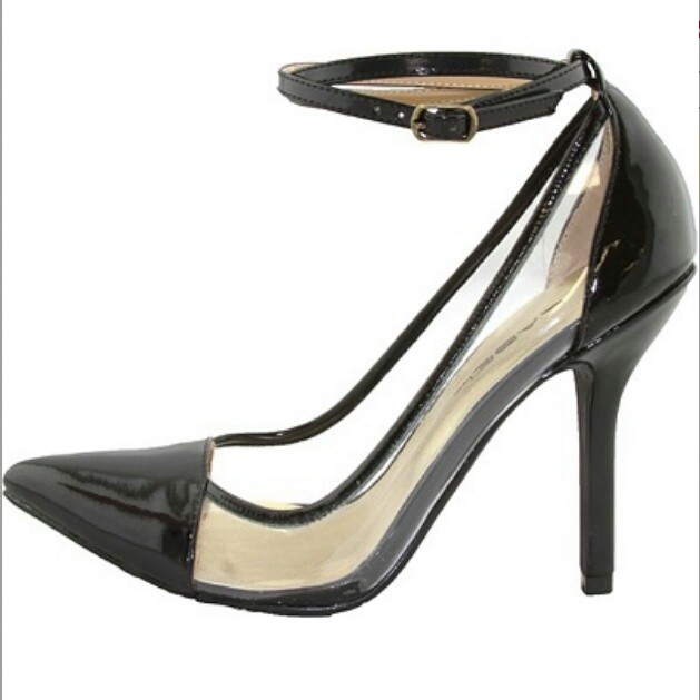 This is a very sexy pump heels featuring black faux patent leather, pointed closed toes, cross ankle buckle, clear sides, cushioned footbed, and finished with rubber soles. Approximately 1/2 inch platform and 4 1/4 inch heels.
